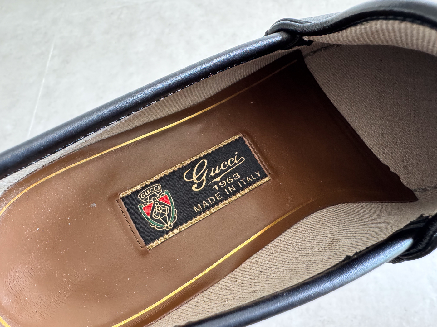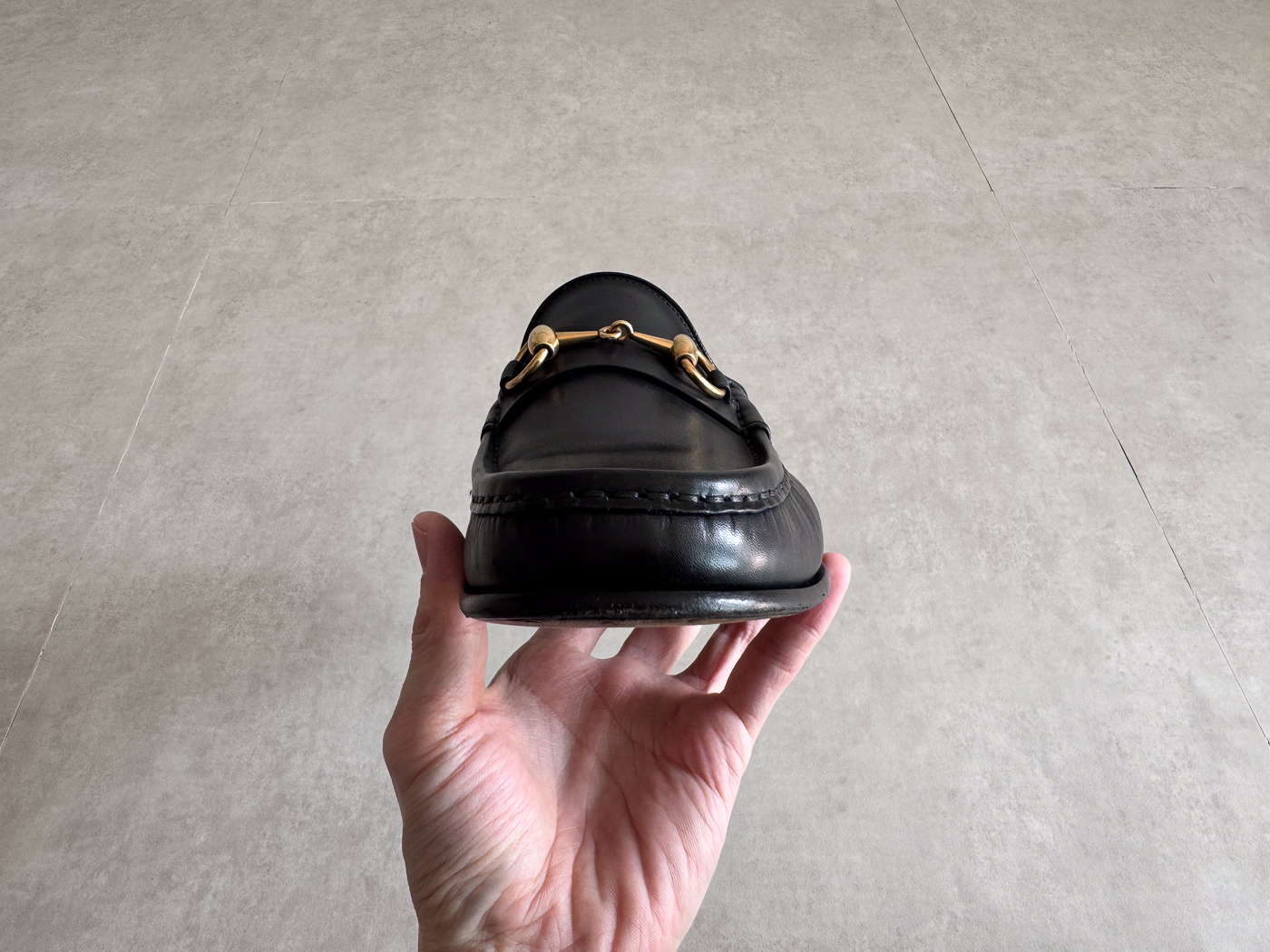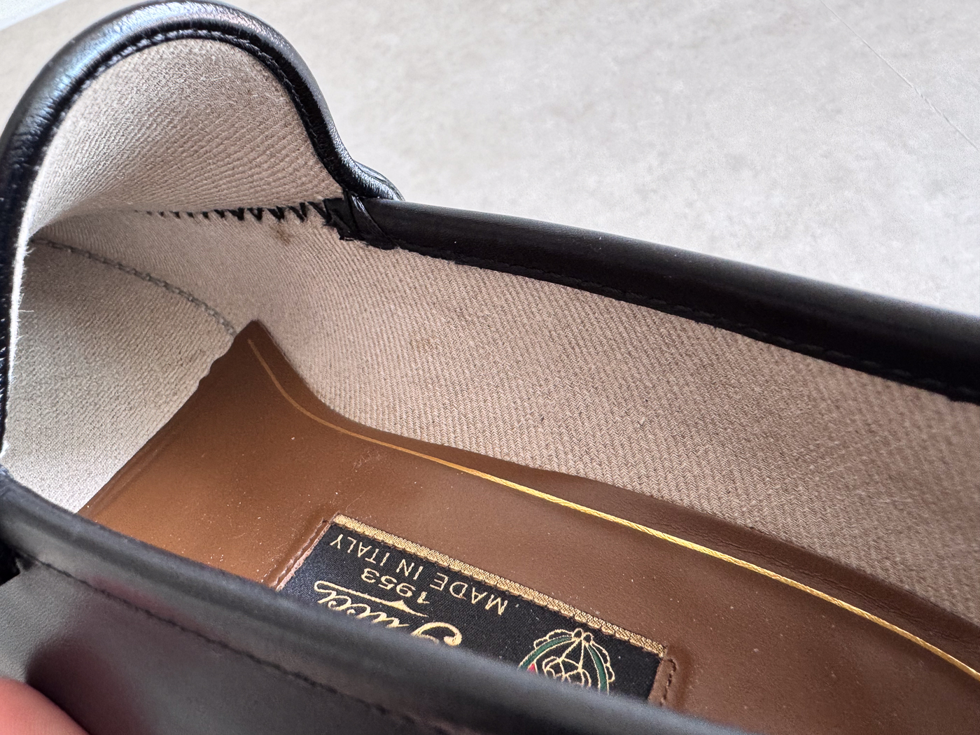 로퍼의 앞코에는 말의 재갈과 굴레에서 영감을 받은 금속 장식, ‘홀스빗’이 얹혀 있으며, 이는 지금까지도 구찌의 상징으로 자리 잡고 있습니다.