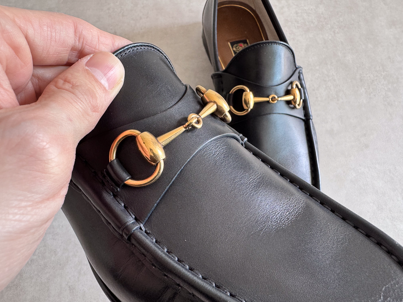 로퍼의 앞코에는 말의 재갈과 굴레에서 영감을 받은 금속 장식, ‘홀스빗’이 얹혀 있으며, 이는 지금까지도 구찌의 상징으로 자리 잡고 있습니다.