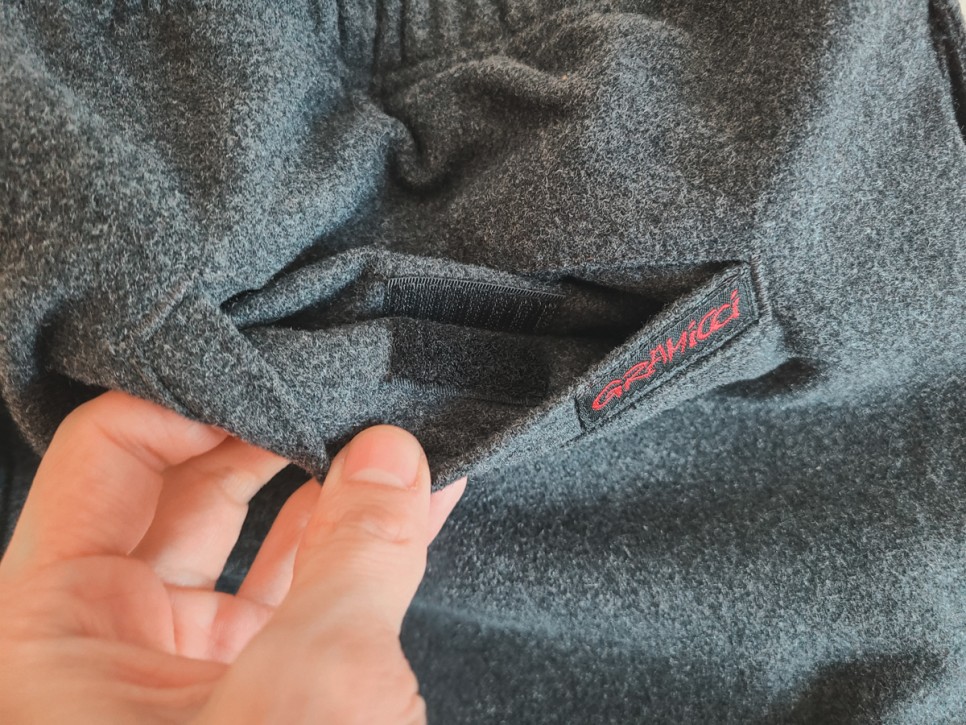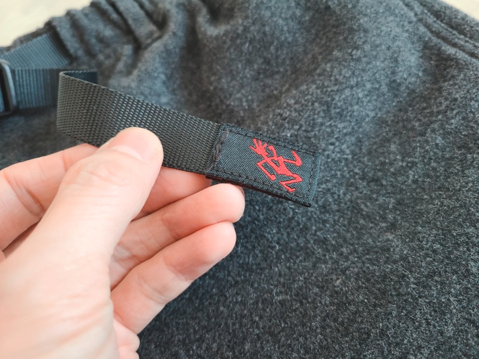 아래 사진에서 보이는 것 처럼 가랑이 부분 가젯 디테일이나 위빙벨트, 런닝맨 로고 등 기존의 그라미치 팬츠의 요소는 모두 포함됩니다.