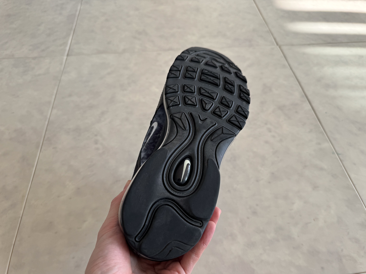 이름에서 알 수 있듯이 1997년 처음 출시되었고, 어퍼를 빙 둘러 이어진 가죽 덧댐 디자인과 투명 아웃솔 전체에 이어진 에어가 에어맥스97만의 독특한 디자인이 특징입니다.