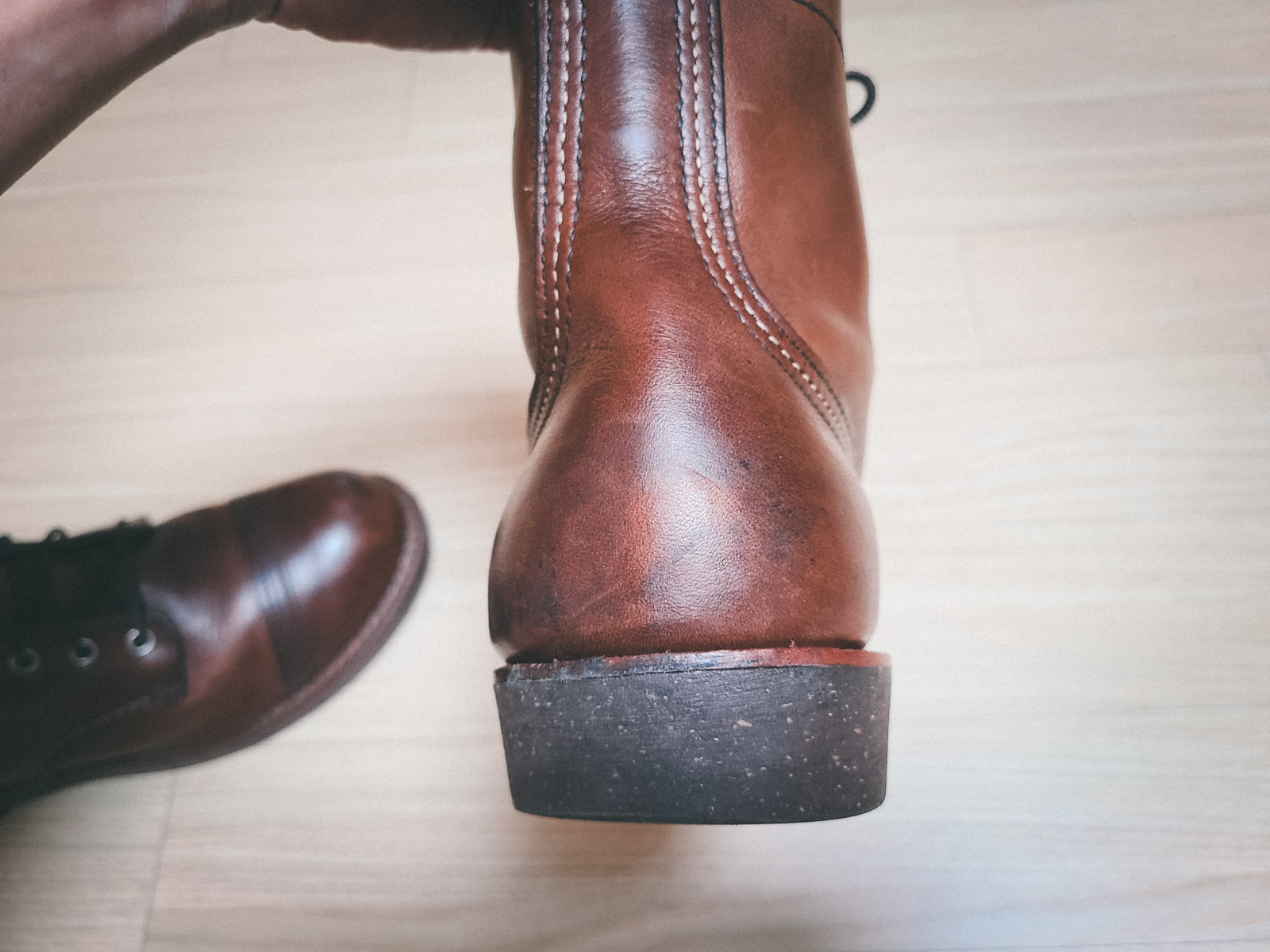 레드윙 아이언 레인저 8111의 가죽은 기름을 잔뜩 머금은 오일리한 가죽입니다. 따라서 웬만한 경우라면 브러시 만으로도 광택이 잘 올라오며 물이나 오염, 스크레치에 강한 편입니다. (사실 스크레치가 많이 난 부츠도 매력적입니다) 또한 슈크림을 써주며 관리하면 비교적 에이징도 잘 되는 편입니다. 아이언 레인저는 몇 가지 소재와 컬러로 출시되는데 8111은 레드윙의 앰버 하니스 컬러로 여기저기 매치하기 좋은 붉으스름한 브라운 컬러의 가죽입니다. 착용할 수록 조금씩 짙어지는 색감이 일품입니다.
