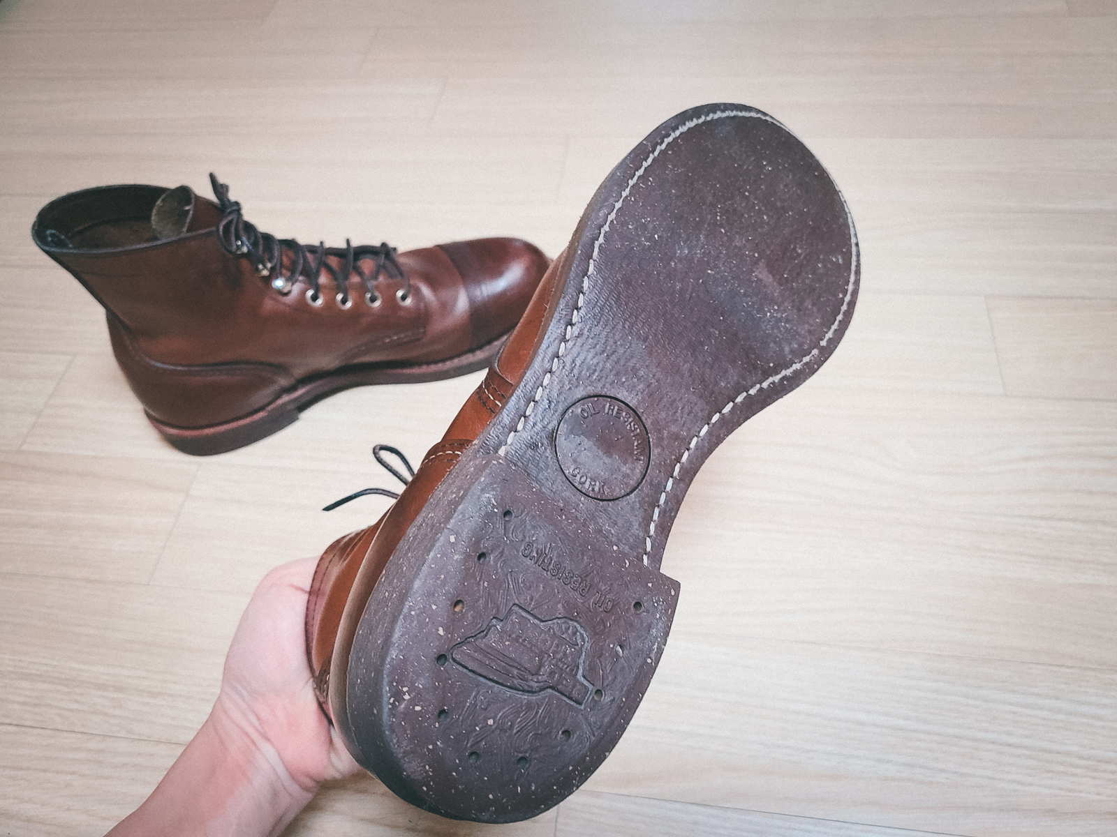 레드윙 아이언 레인저 8111의 가죽은 기름을 잔뜩 머금은 오일리한 가죽입니다. 따라서 웬만한 경우라면 브러시 만으로도 광택이 잘 올라오며 물이나 오염, 스크레치에 강한 편입니다. (사실 스크레치가 많이 난 부츠도 매력적입니다) 또한 슈크림을 써주며 관리하면 비교적 에이징도 잘 되는 편입니다. 아이언 레인저는 몇 가지 소재와 컬러로 출시되는데 8111은 레드윙의 앰버 하니스 컬러로 여기저기 매치하기 좋은 붉으스름한 브라운 컬러의 가죽입니다. 착용할 수록 조금씩 짙어지는 색감이 일품입니다.
