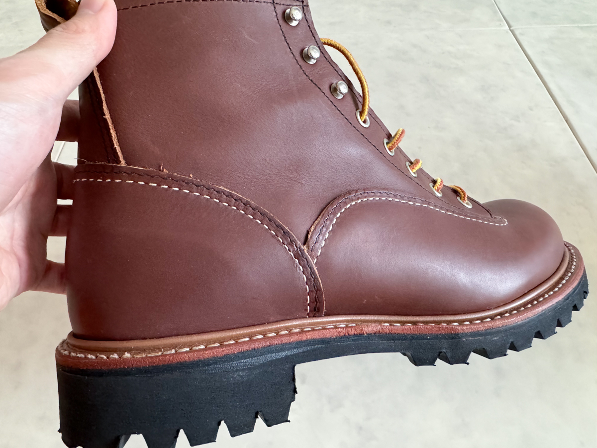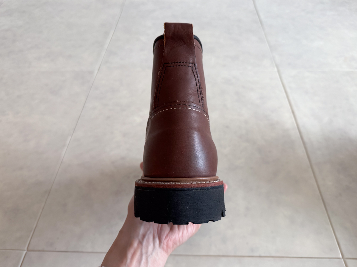 작업자들의 발을 보호하기 위해 매우 견고한 가죽으로 제작되었으며, 발가락 부분은 여유 공간이 넉넉해 편안합니다. 발등까지 끈이 내려오는 레이스 투 토 디자인 덕분에 발 전체를 단단히 고정할 수 있어 작업 중에도 안정감을 제공하죠. 부츠의 앞뒤에 더해진 가죽 덧댐은 장기간 착용해도 형태를 잘 유지하도록 도와줍니다. 물론 그만큼 브레이크인 과정이 험난한 부츠로 유명하죠. 게다가 비브람 러그 솔은 트랙터 타이어처럼 깊고 굵은 홈이 있어 뛰어난 접지력과 내구성을 자랑합니다.
