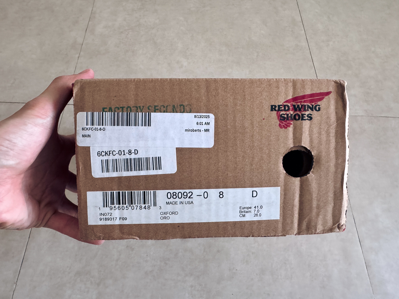 박스에는 “Factory Second” 스탬프가 찍혀 있고, 텅 부분에는 작은 펀칭 홀로 구분됩니다.
