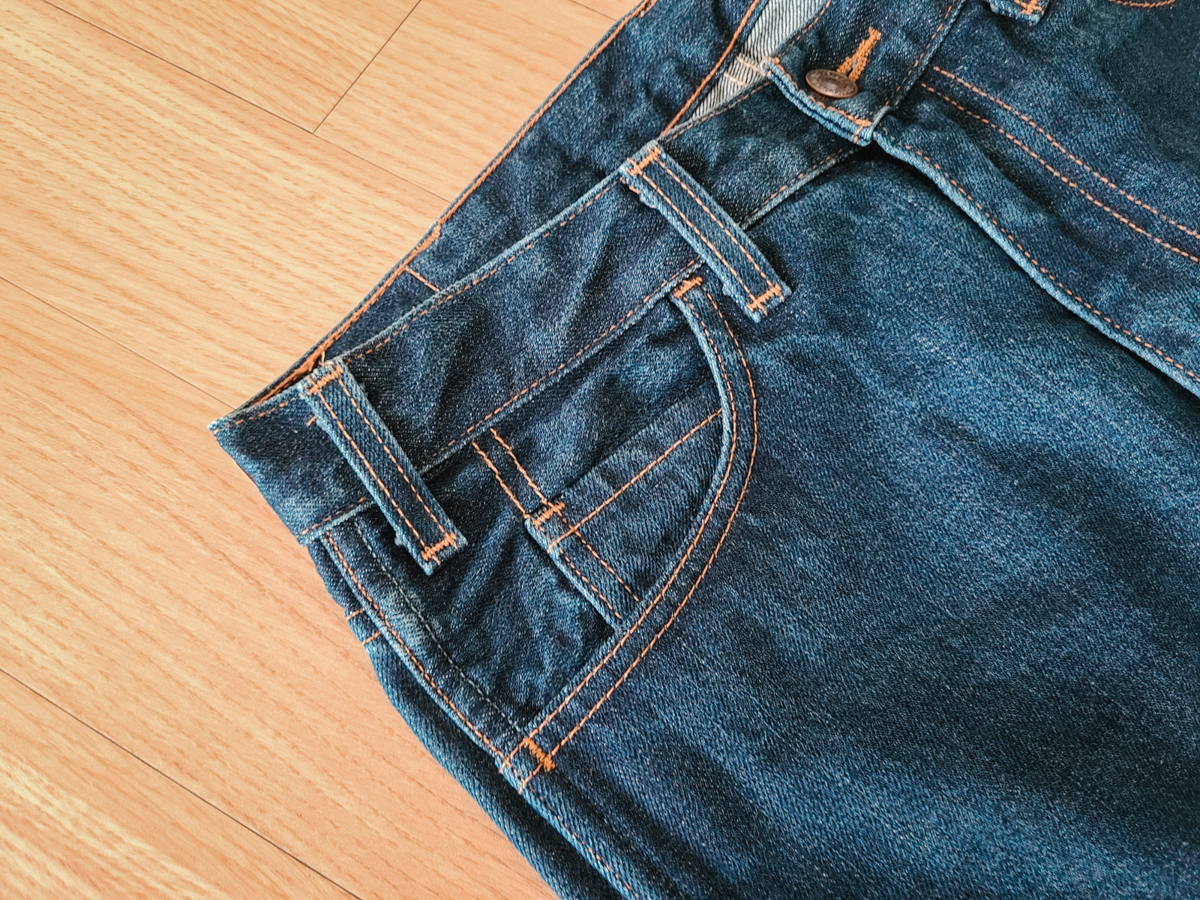 백포켓 오렌지 탭, 탈론 지퍼 등 LVC 본연의 디테일은 살아있는 제품으로 콘밀 리지드 데님원단으로 청청한 색감이 매력적이고 슬림한 핏에 비해 착용감은 좋은 편입니다.