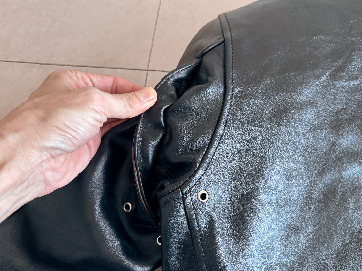 30년대 스포츠 재킷 실루엣에 차심 말가죽이 쓰였고 마침 실측 사이즈가 잘 맞을것으로 판단하여 일단 실패하더라도 수업료라고 생각하고 주문해봤는데 첫인상부터 기대 이상이었습니다.