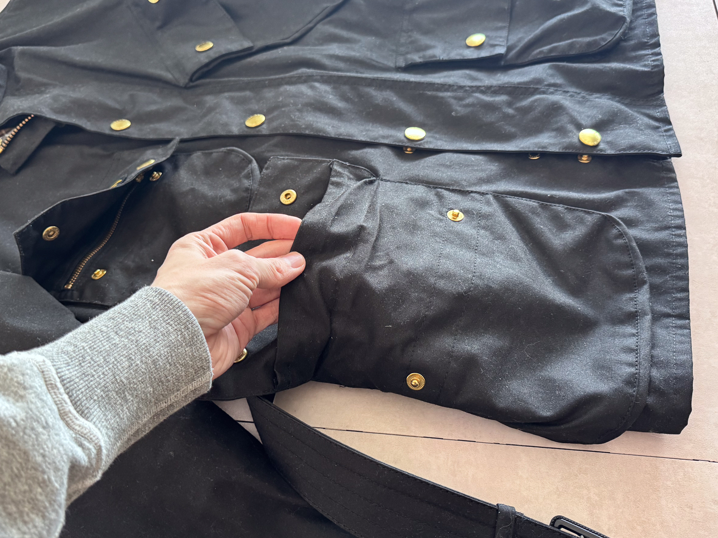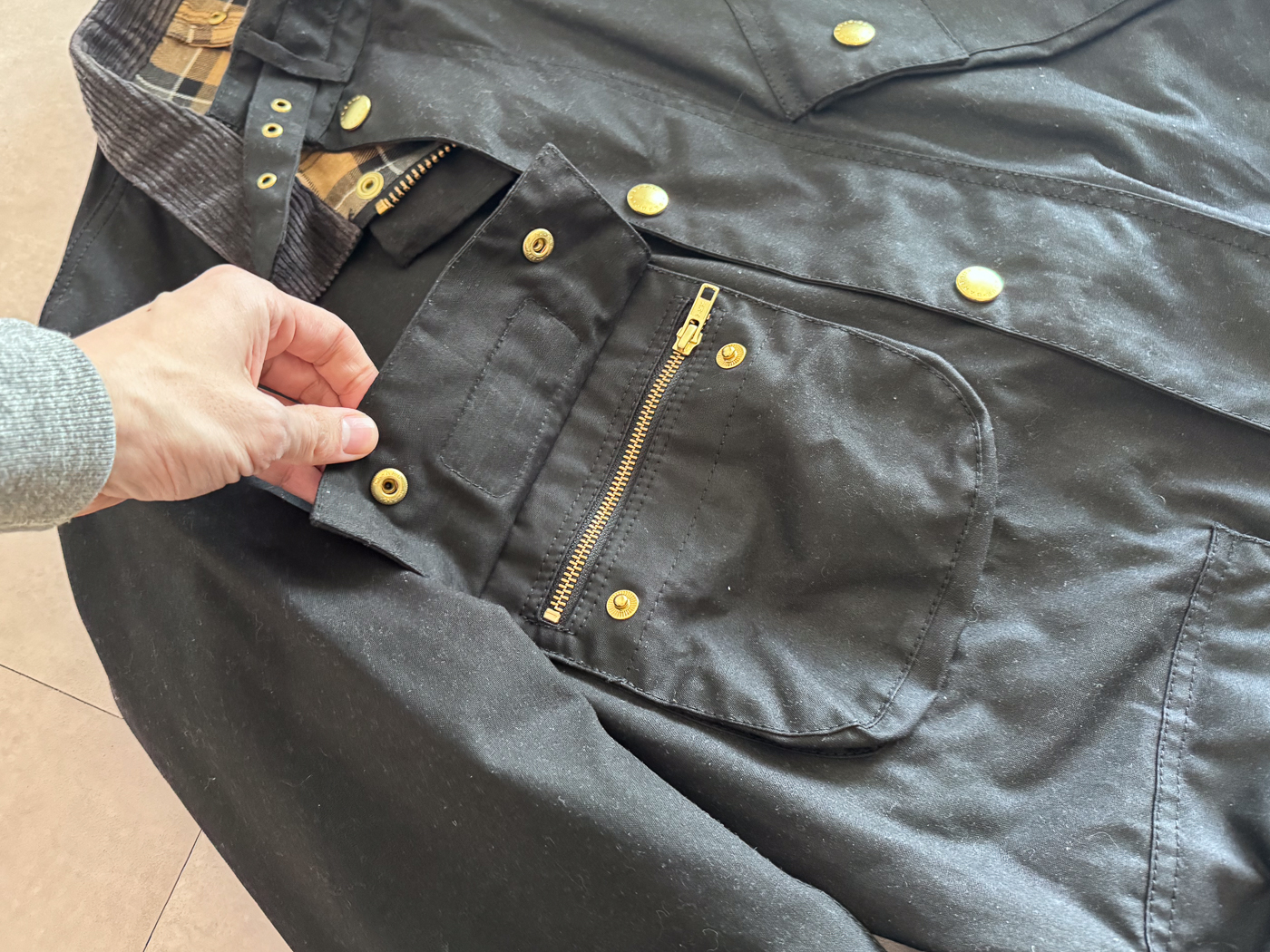 - 기능적인 디테일: 왼쪽 가슴에 비스듬히 배치된 사선 지도 포켓(Map Pocket)은 이 옷의 정체성입니다. 주행 중 오른손으로 지도를 꺼내기 쉽게 만든 이 디테일은, '형태는 기능을 따른다'는 말을 가장 잘 보여주는 부분이죠.