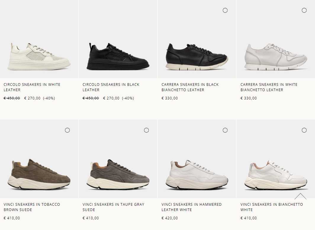 카레라(CARRERA) 스니커즈 - 스포티한 디자인이 돋보이는 디자인입니다. 캐주얼과 포멀 모두 어울리는 디자인으로 가죽 끈, 텅 부분 솔기가 있는 가죽 라벨과 양각으로 부테로 로고 디테일, 가벼운 고무 소재의 비브람 아웃솔이 특징입니다. 타니노와 마찬가지로 다양한 컬러, 소재로 출시되고 있으나 크랙 효과 가죽 제품이 인기가 많습니다. 이탈리아산 BIANCHETTO 가죽에 수지 마감처리 하여 딱딱한 효과를 내는 것이 특징입니다. 신을수록 부드러워지며 에이징 됩니다. 평소 구두 사이즈대로 선택하는 것을 추천합니다.