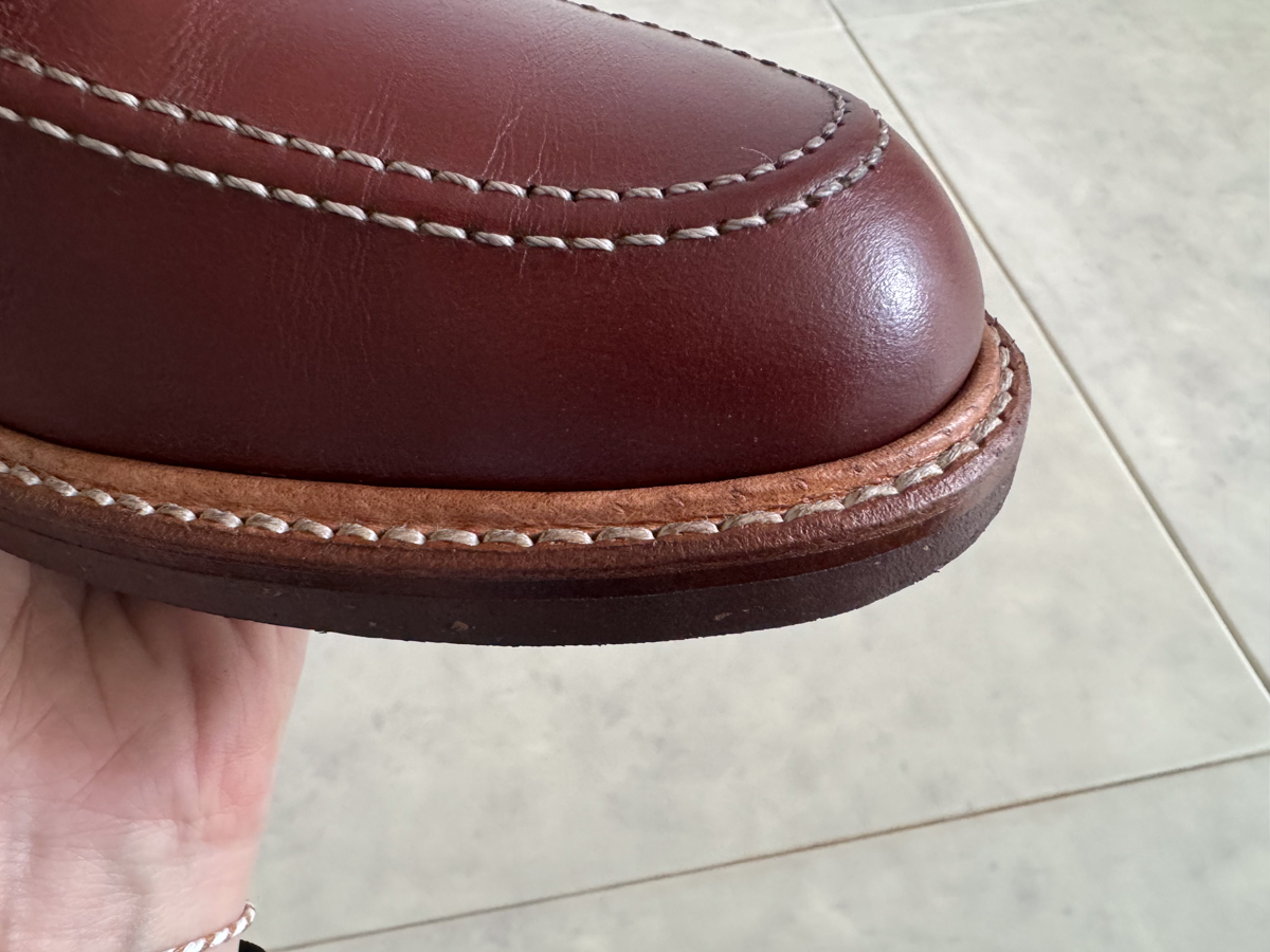 웰트는 밝은 색. 웰트를 어퍼와 인솔을 꿰메고 그 뒤에 다시한번 아웃솔과 꿰면 굿이어웰트 방식. 밑창 교체가 원활하고 물이 부츠 안으로 들어오지 않는다.
