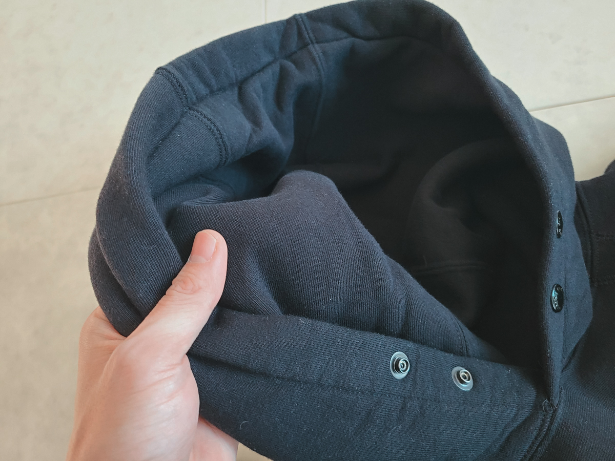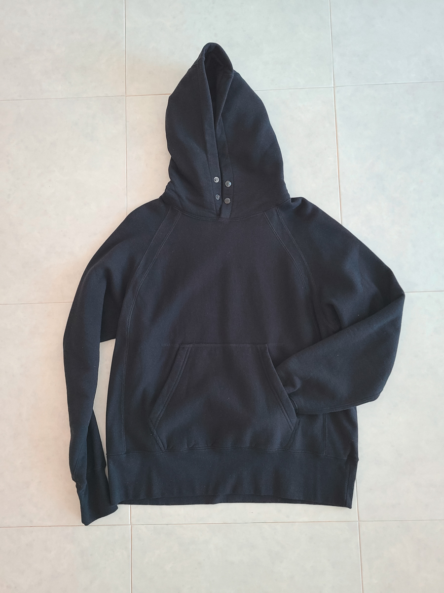 엔지니어드 가먼츠의 스웻 후드는 독특한 변형이 있습니다. 바로 흔히 볼 수 있는 후드를 여밀수 있는 끈 대신 스냅 버튼이 두개 달려 있는데요. 이게 생각보다 편리하고 독특한 실루엣으로 연출할 수 있게 해줍니다.