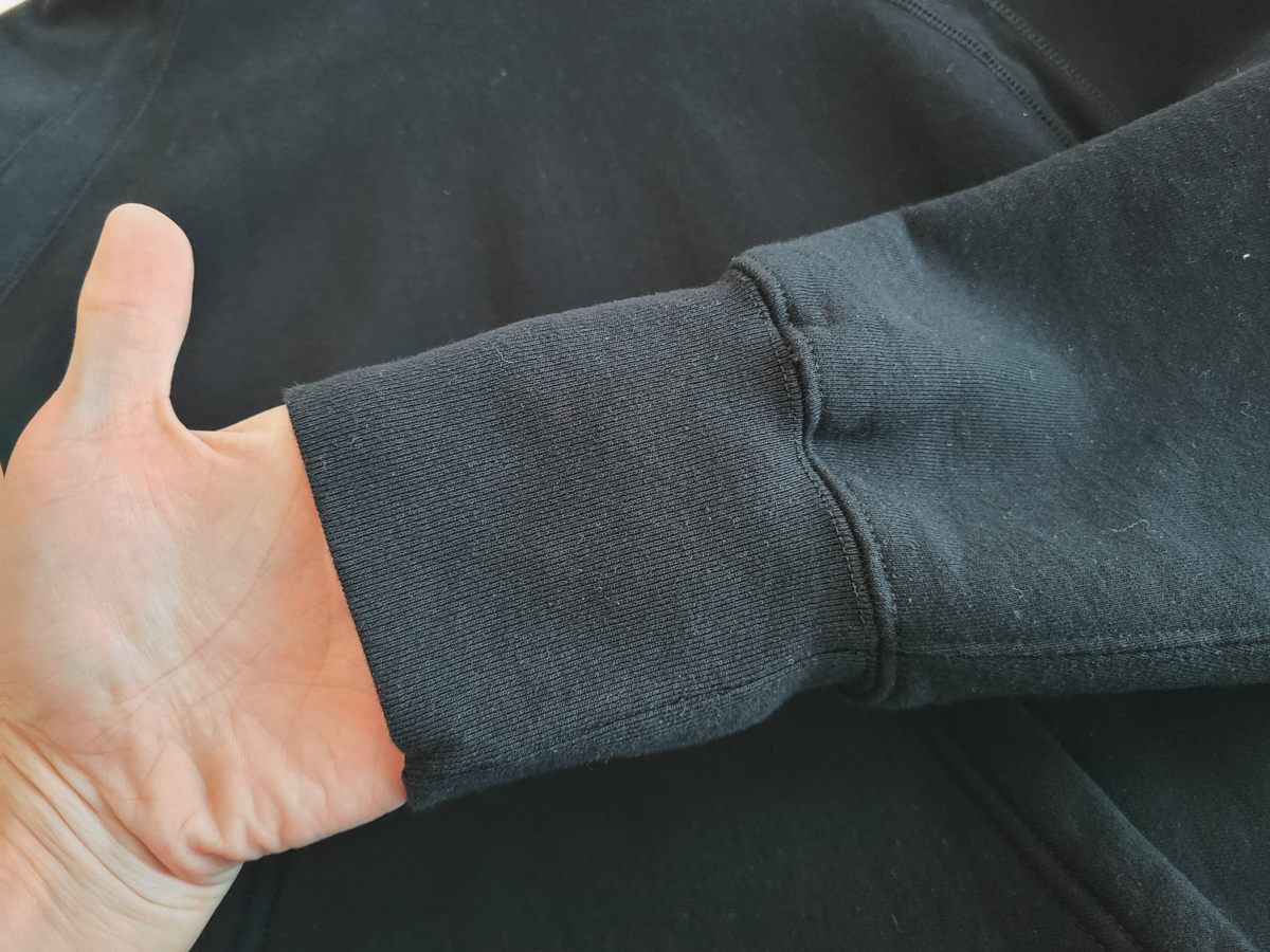 사이즈에 비해 총장이 긴 편이 아니며 (그러나 크롭 하지도 않습니다) 하단 시보리도 적당한 텐션으로 스웨트 셔츠 안에 레이어드해서 입기 좋았습니다.