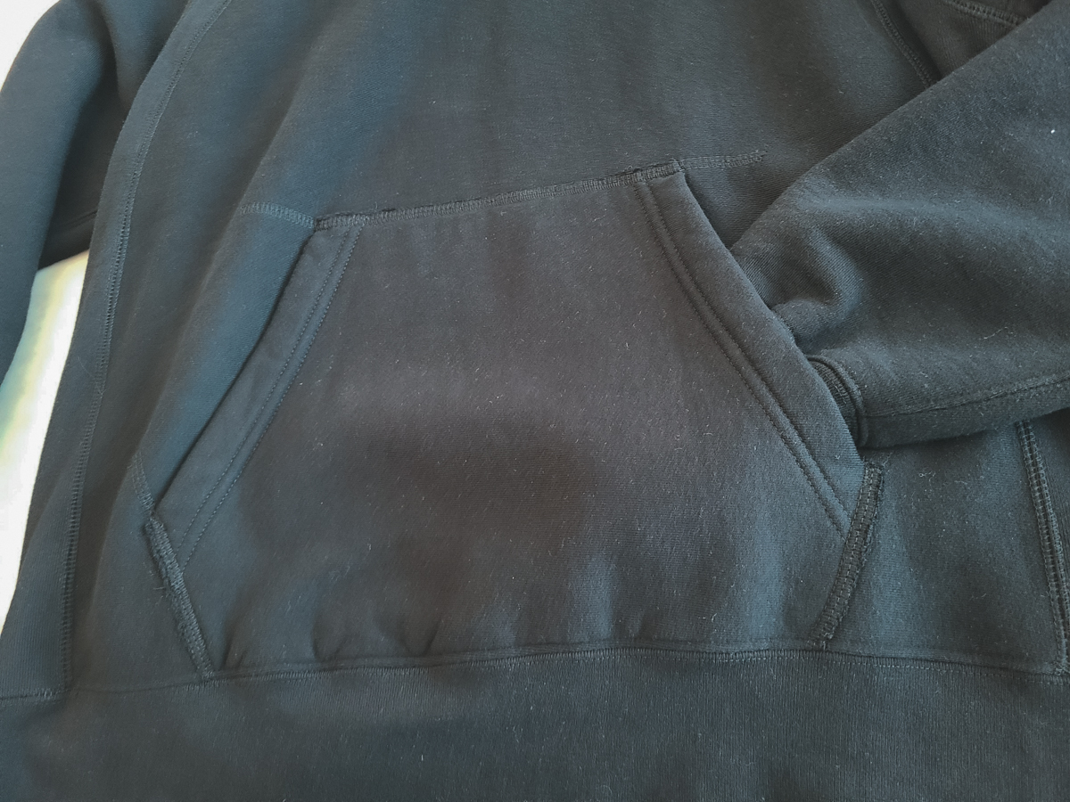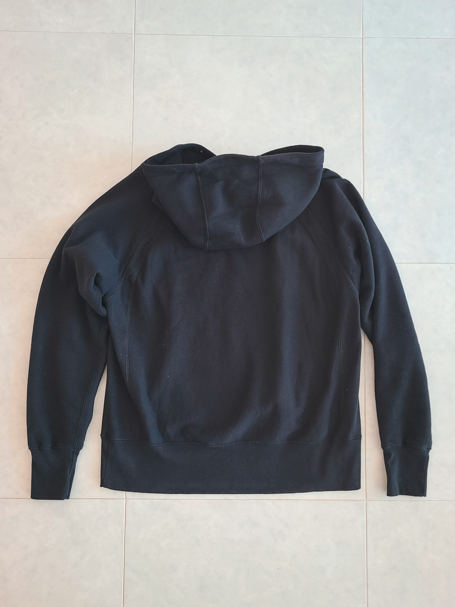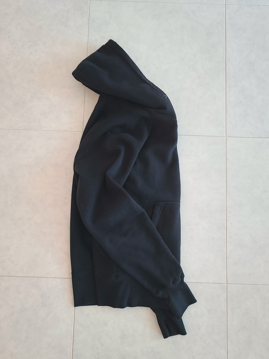 엔가 답게 클래식한 후드 스웻의 디테일을 볼 수 있는데요. 복각 스웻에서 많이 볼 수 있는 긴 소매 시보리와 하단부 시보리와 몸통 옆으로 이어지는 디테일이 독특합니다.