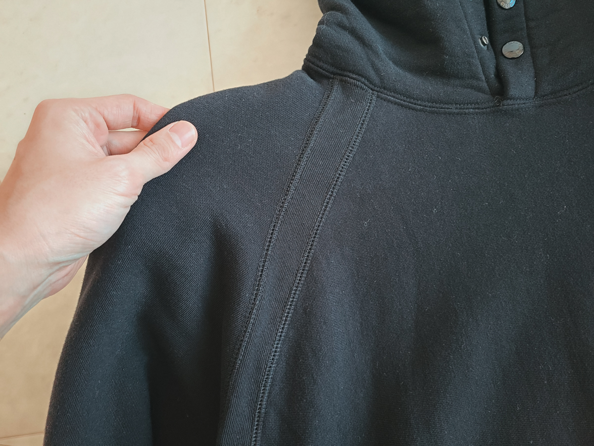 이름에서 알 수 있듯 도톰한 내부 기모(플리스) 재질의 어깨선이 없는 래글런 후드 스웨트 셔츠입니다.