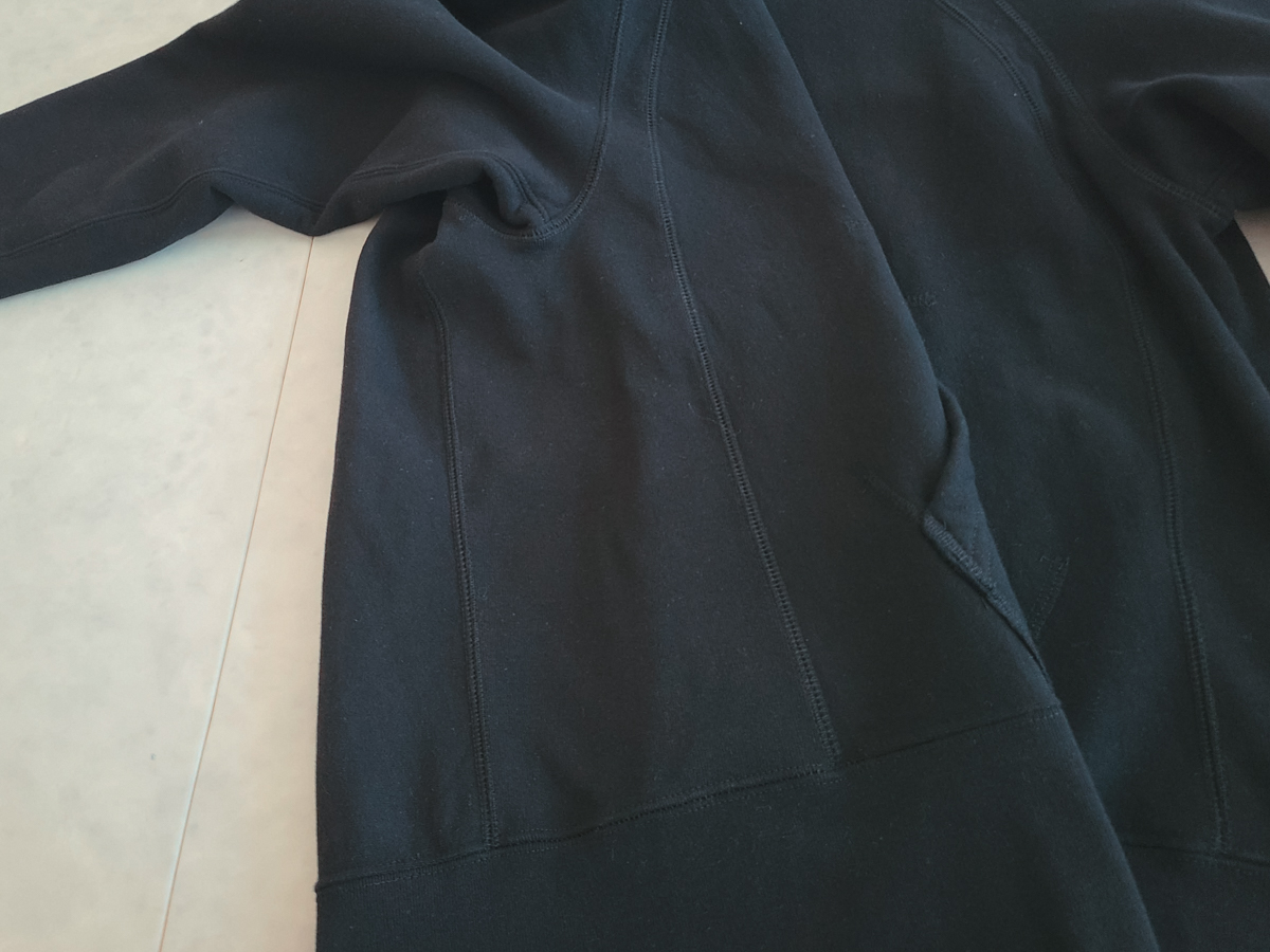 엔가 답게 클래식한 후드 스웻의 디테일을 볼 수 있는데요. 복각 스웻에서 많이 볼 수 있는 긴 소매 시보리와 하단부 시보리와 몸통 옆으로 이어지는 디테일이 독특합니다.