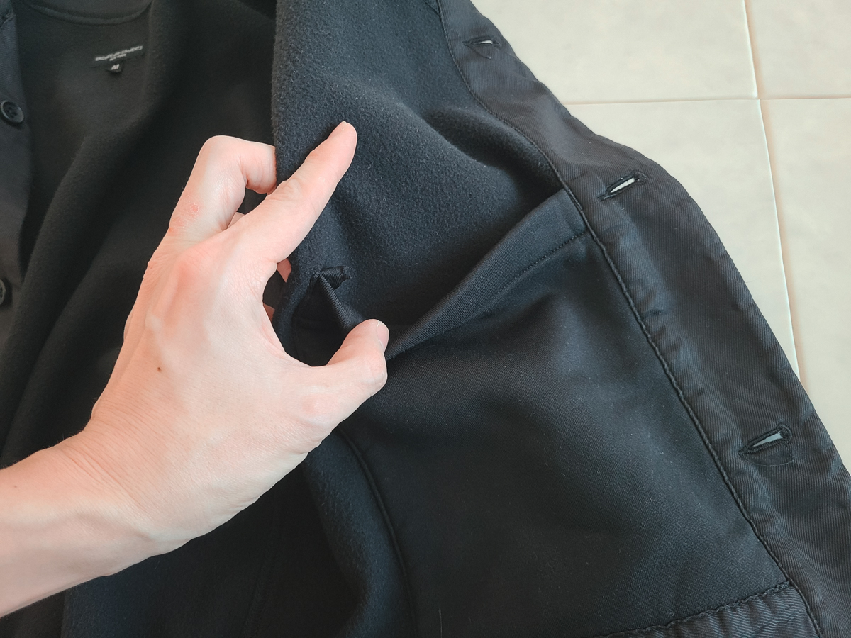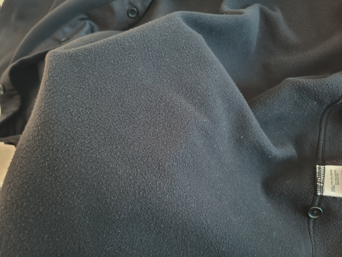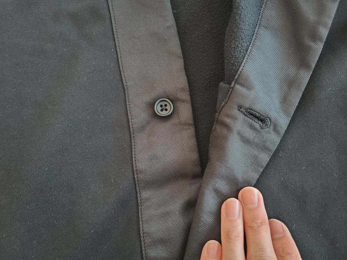제품의 이름에서 알 수 있듯 가디건 겉면은 트랙 재킷 (흔히 볼 수 있는 트레이닝 복)의 가볍고 살짝 광택이 있는 소재이고, 안감은 기모 플리스 소재로 되어 있습니다.