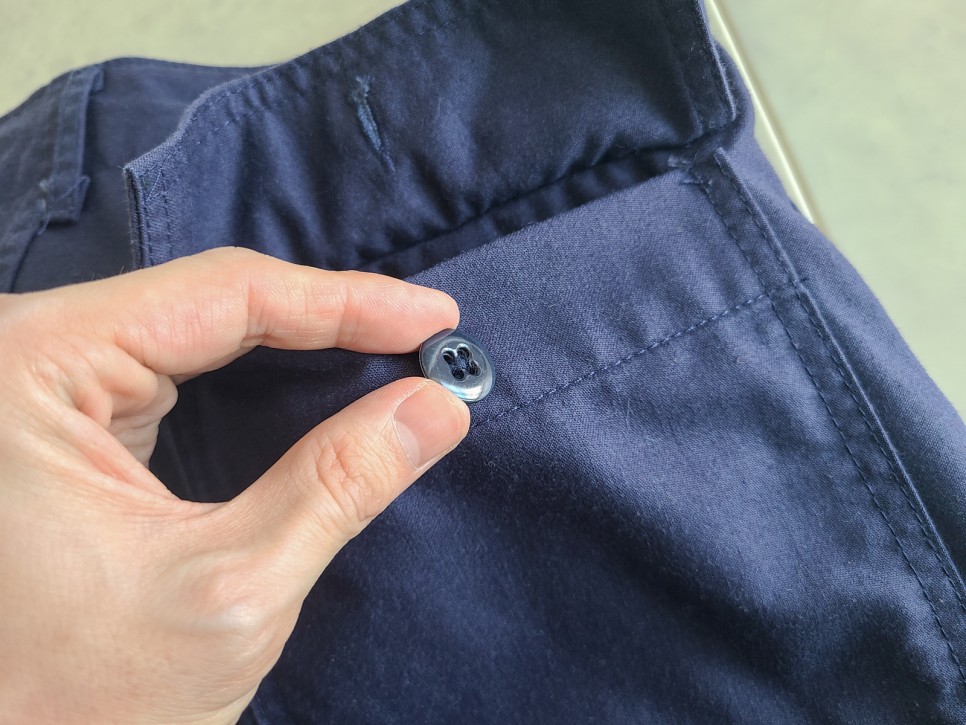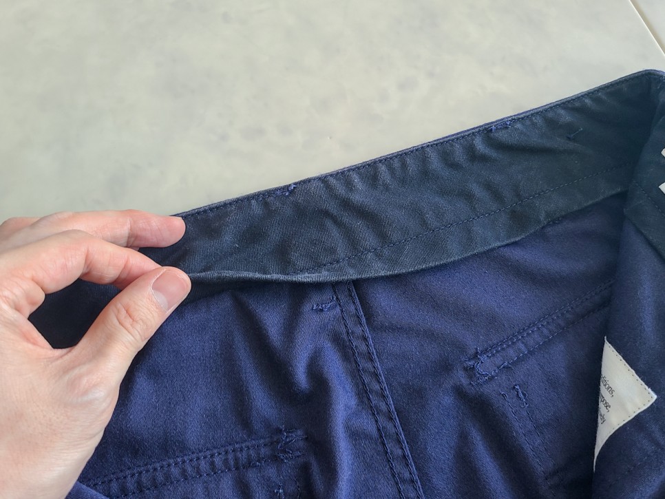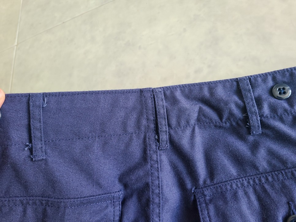 허리춤을 조일 수 있는 어저스트. 보통은 단추가 두 개 달려 있는데 이건 하나만 있네요.