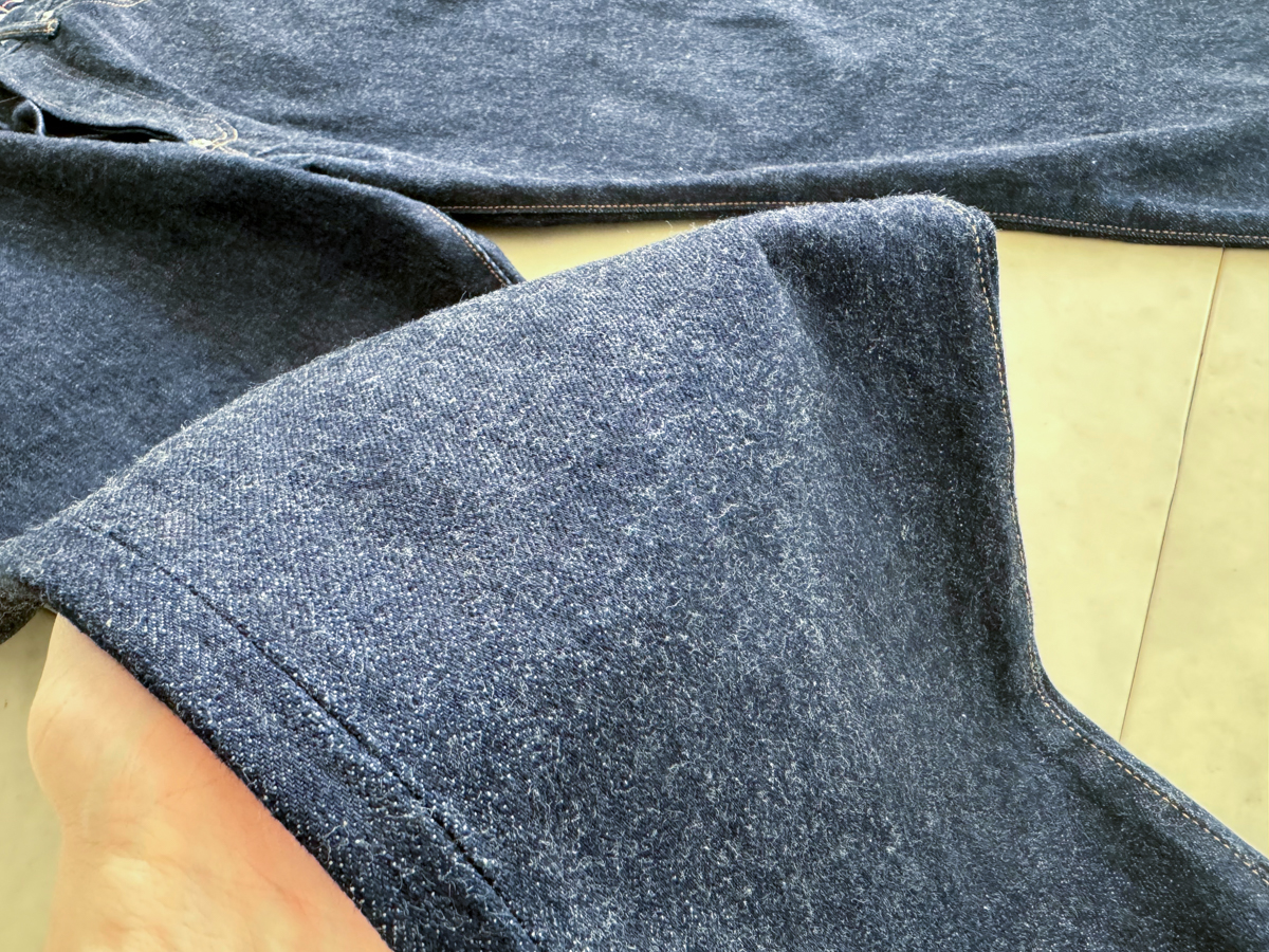 13oz의 밀도 있고 부드러운 면 100% 원단이 사용되었으며 인디고 특유의 푸른 느낌이 돕니다.
