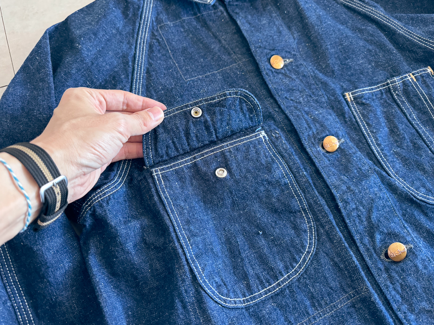 황동 버튼과 덮개가 있는 포켓과 스냅버튼.. 당시 워크 재킷에서 나타난 특징을 재현하고 있다