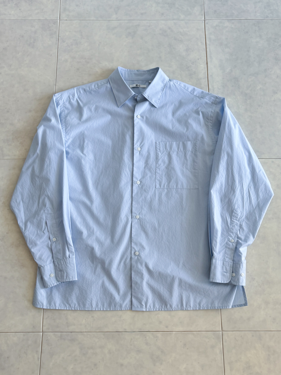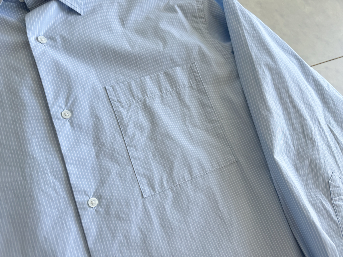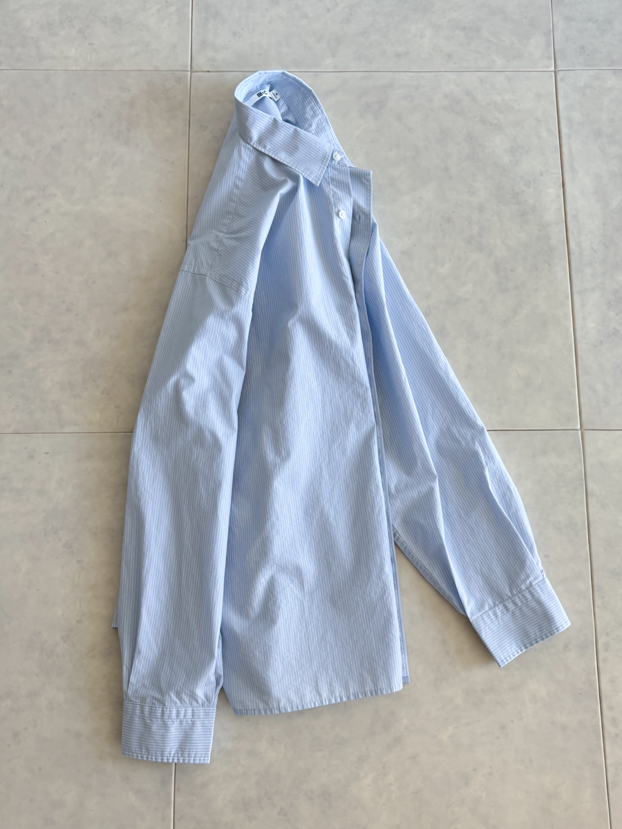 저는 그중에서도 브로드오버사이즈 셔츠를 직접 구매하여 입어보았습니다. 공개된 여러 컬러 중에서도 특히 잔잔한 스트라이프가 들어간 블루 컬러는 깔끔하면서도 유니크한 매력을 지니고 있어 구매하였습니다.