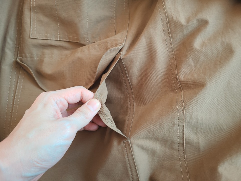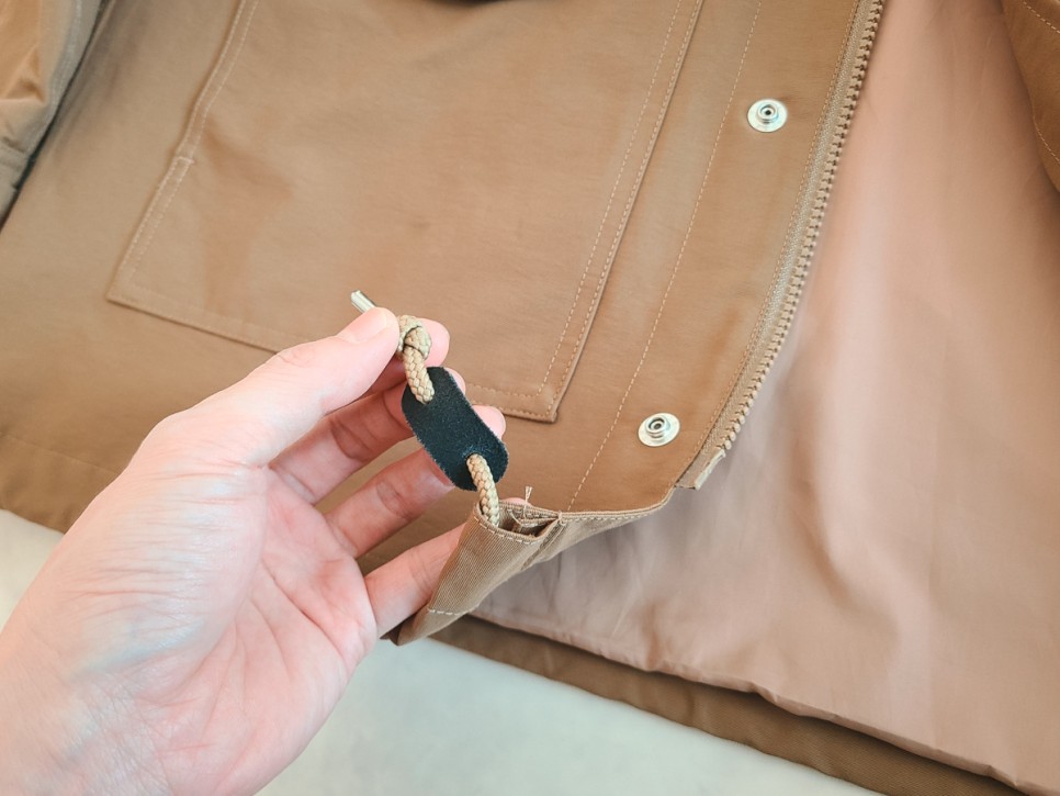 탈부착이 가능한 후드, 밑단을 조일 수 있는 끈과 가슴과 사이드 2쌍의 포켓이 있습니다.
