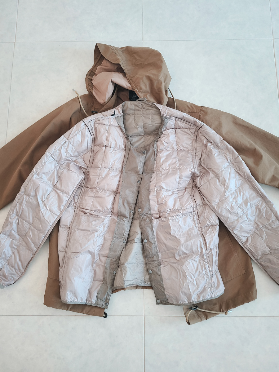 필드 재킷 형태로 베이지 컬러에 비슷한 색감의 경량 패딩이 세트로 나온 제품입니다.