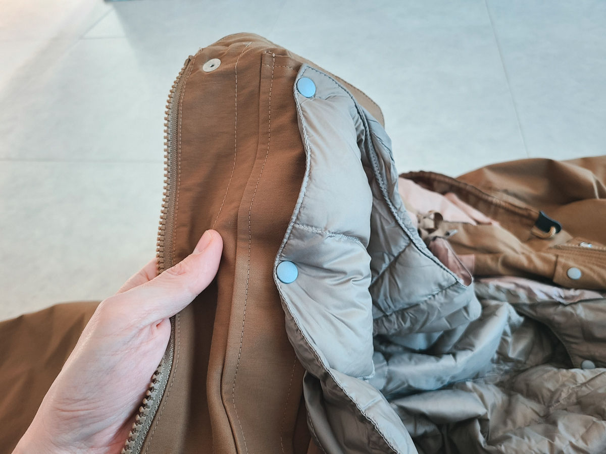 여밈은 YKK 2way 지퍼와 스냅 단추로 되어 있어 다양한 연출이 가능합니다.