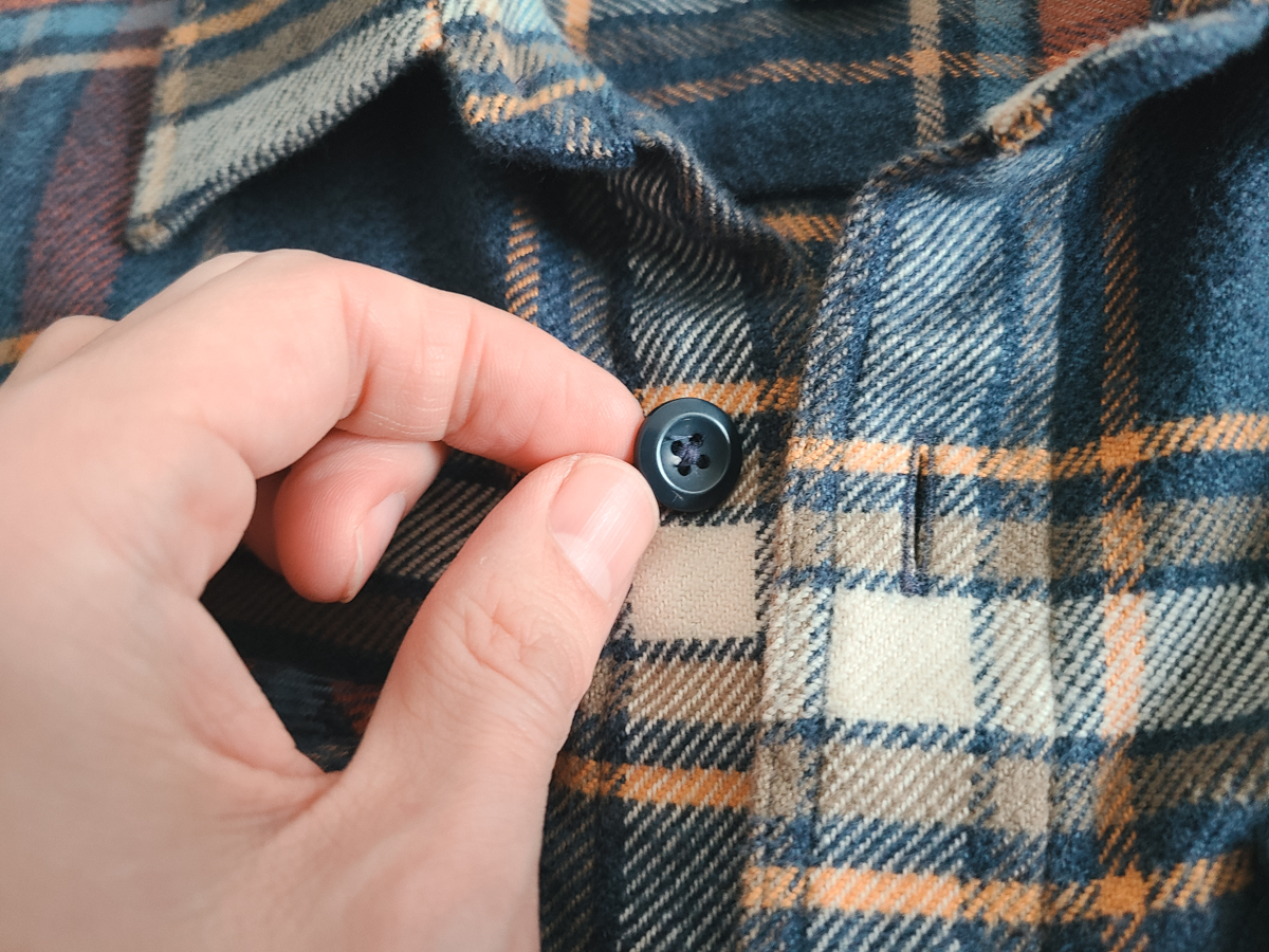 단추는 원단과 잘 맞는 색감에 실용적인 플라스틱 소재로 잘 달려 있습니다.