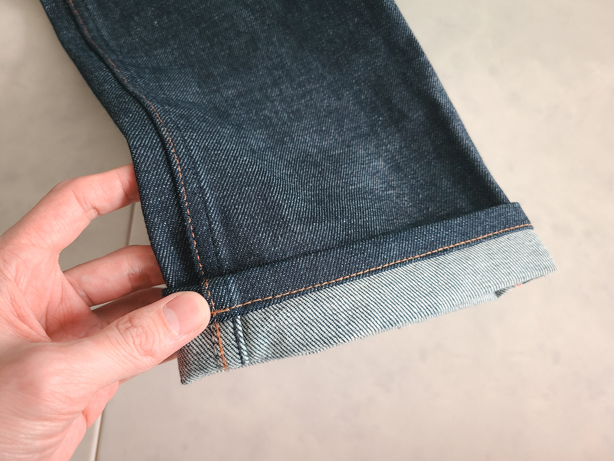 보통 밑 위 길이에 무릎단부터 스트레이트 핏이며 생지 특유의 뻣뻣함과 광택이 도는 짙은 네이비 컬러가 특징입니다.